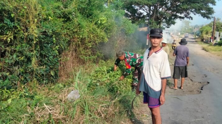 PESANGGARAN – Babinsa Koramil 0825-11/Pesanggaran Kodim 0825/Banyuwangi, Sertu Guntari bersama warga binaan bergotong royong melaksanakan pembersihan ruas kanan kiri jalan di Desa Sumbermulyo, Kecamatan