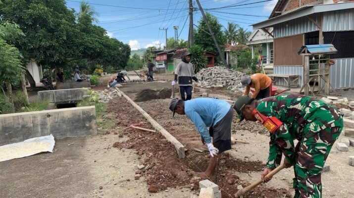Babinsa Koramil 0825-11/Pesanggaran Gotong Royong Kerja Bakti Pavingisasi Jalan Desa Bersama Warga Masyarakat