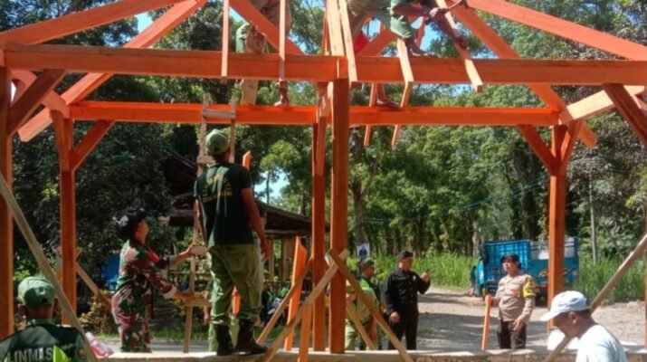 PESANGGARAN – Babinsa Koramil 0825-11/Pesanggaran, gotong royong membuat pos linmas untuk meningkatkan keamanan dan mempererat sinergi dengan masyarakat berlokasi Dusun Sumberjambe Desa Kandangan Kecamatan Pesanggaran Kabupaten Banyuwangi.