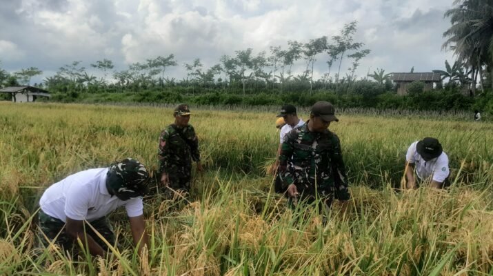 Pesanggaran – Dalam rangka mendukung program ketahanan pangan nasional, Pelda Margoto Anggota Koramil 0825-11/Pesanggaran Kodim 0825/Banyuwangi melaksanakan pendampingan kepada petani saat memanen padi di Dusun Ringinsari Desa Pesanggaran Kecamatan Pesanggaran Kabupaten Banyuwangi, Minggu (05/04/2026).