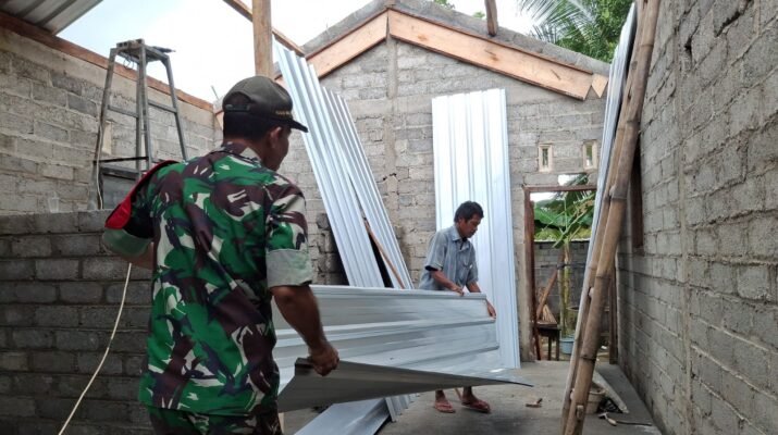Dalam kunjungannya, Kapten Inf Sumitro memantau proses pemasangan atap rumah yang sedang dikerjakan oleh anggota Satgas TMMD bersama warga sekitar. Tampak sinergi dan semangat gotong royong begitu terasa dalam pembangunan rumah tersebut, sebagai wujud nyata dari kemanunggalan TNI dan rakyat.