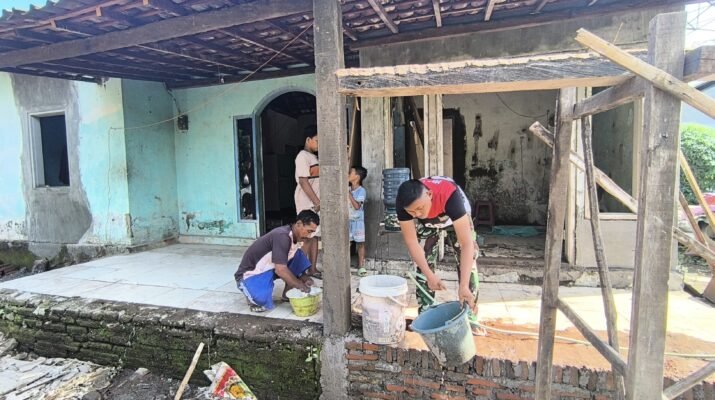Udara pagi masih sejuk saat suara palu dan adukan semen mulai terdengar dari sebuah rumah sederhana di Desa Wonosari, Kecamatan Gondangwetan, Kabupaten Pasuruan, Minggu (8/3/2026). Praka Damar, anggota Satgas TMMD Ke-127 Kodim 0819/Pasuruan, bersama warga tampak bergotong royong memperbaiki rumah milik Bapak Muklis.