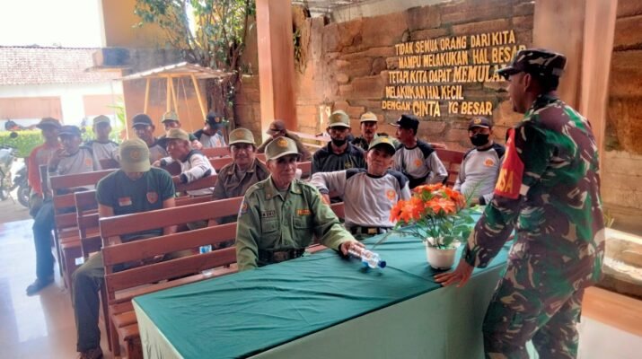 Pesanggaran – Babinsa Desa Kandangan Koramil 0825-11/Pesanggaran Sertu Nurhidayanto memberikan materi bela negara dan wawasan kebangsaan kepada anggota Perlindungan Masyarakat (Linmas) sebagai bagian dari tugas