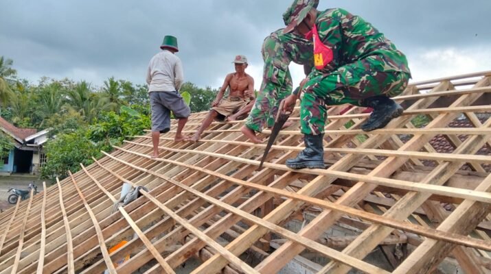 Banyuwangi, 26 Juli 2025 – Aksi nyata pengabdian ditunjukkan oleh Sertu Bambang Darmawan, Babinsa Desa Kesilir yang tergabung dalam Satgas TMMD ke-125 Kodim 0825/Banyuwangi. Dalam pelaksanaan program Rumah Tidak Layak Huni (Rutilahu), ia turut serta memasang genteng di atap rumah milik Bapak Teguh Wiyono, warga kurang mampu di Kecamatan Siliragung.