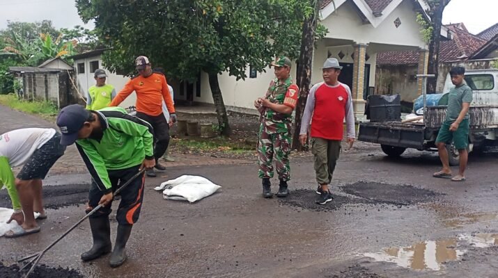 Babinsa Koramil 0825/09 Tegaldlimo, Gotong Royong Warga Ringing Anom Sukses Uruk Jalan Berlubang dengan Aspal Kebo