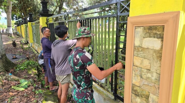 PESANGGARAN – Bintara Pembina Desa (Babinsa) Koramil 0825-11/Pesanggaran Sertu Nurhidayanto turut membantu warga dalam melaksanakan gotong royong kerja bakti pembangunan Masjid Jami’ Al Falah
