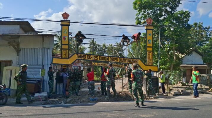 Banyuwangi – Program TNI Manunggal Membangun Desa (TMMD) ke-125 Kodim 0825/Banyuwangi terus menunjukkan progres nyata. Salah satunya pembangunan gapura jalan menuju jembatan di Desa