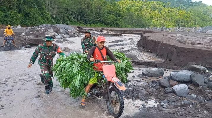 Lumajang – Di tengah cuaca yang tidak menentu dan aktivitas lahar dingin yang masih terjadi pasca-erupsi Gunung Semeru, Personel TNI kembali menunjukkan komitmen kemanusiaan mereka. Dengan penuh dedikasi, para personel membantu warga yang kesulitan melintasi jalur terdampak material vulkanik di wilayah rawan bencana, Jumat (28/11/2025).